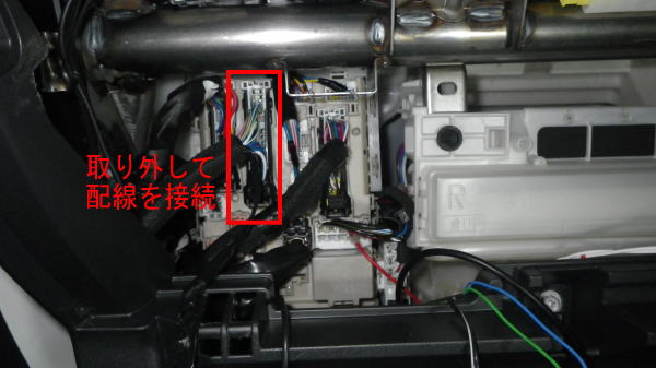 ドアロックコードとハザードリレーの配線を接続します。 助手席のグローブボックスを開けてから手前に引っぱって取り外すと配線が見えます。 赤で囲んでいるカプラーを取り外します。 ドアロックコードは長さが少し短かったので継線しました。