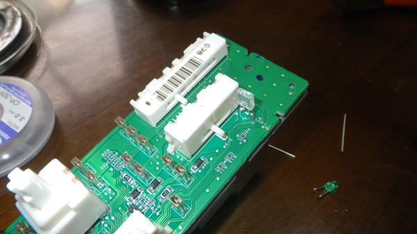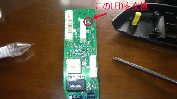 赤丸の緑の3mmLEDを交換します。 基盤にはプラスマイナスの方向の印があるのでLEDのプラスマイナスを間違わないように取り付けます。