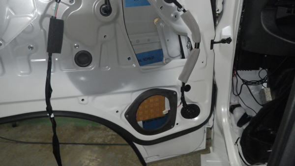 3型ハイエースにはビニールシートがないので掃除の手間が省けました。 サービスホールも鉄板でふさいでいるので、取り外して内部にはレアルシルト(制震シート)を適当な間隔で貼って行きます。 スピーカーはリベット留めになっているのでドリルで壊します。 木製のバッフルボードを取り付け |