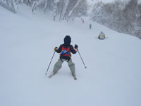 2日目です。一の瀬の天狗コース。 ストックを持って滑りたいとのことなので 板ももう少し長い子供用の板に替えてチャレンジです。 |