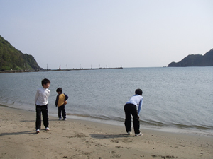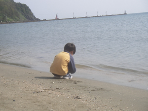 3日目、朝、気比の浜海辺を散歩。 長男は砂浜を走っていました。 |