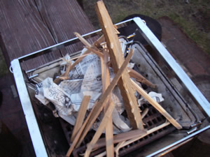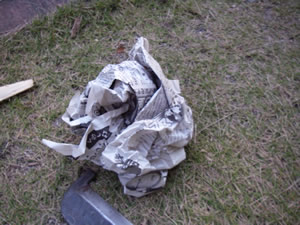 トーチで新聞紙に火を着けます。 マッチやライターでも大丈夫ですよ! 私はタバコをすわないのでマッチもライターも持っていません