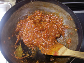 いためます。たまねぎが狐色になってきたら