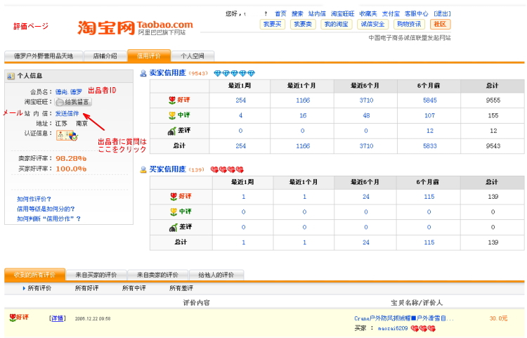 商品説明ページで気になる商品を見つけたら 出品者IDをクリックします。 すると評価の画面が現れますのでその站内信の友站内信件をクリックします
